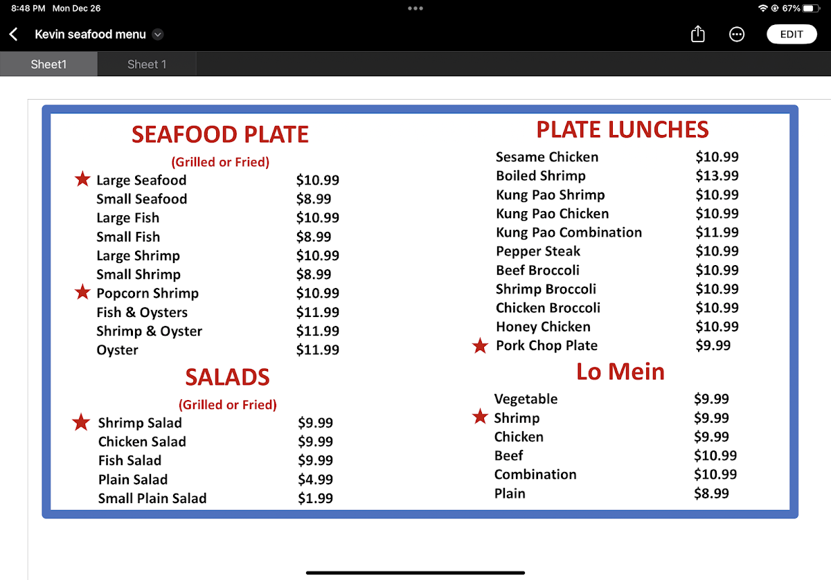 Kevin's Seafood Ambassador Menu